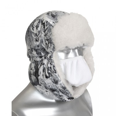 - особенности: маска изготовлена из флиса и предназначена для защиты нижней части лица от холода и ветра; уши под подбородком и наверху фиксируются с помощью липкой ленты,конструкция шапки позволяет носить ее в двух вариантах